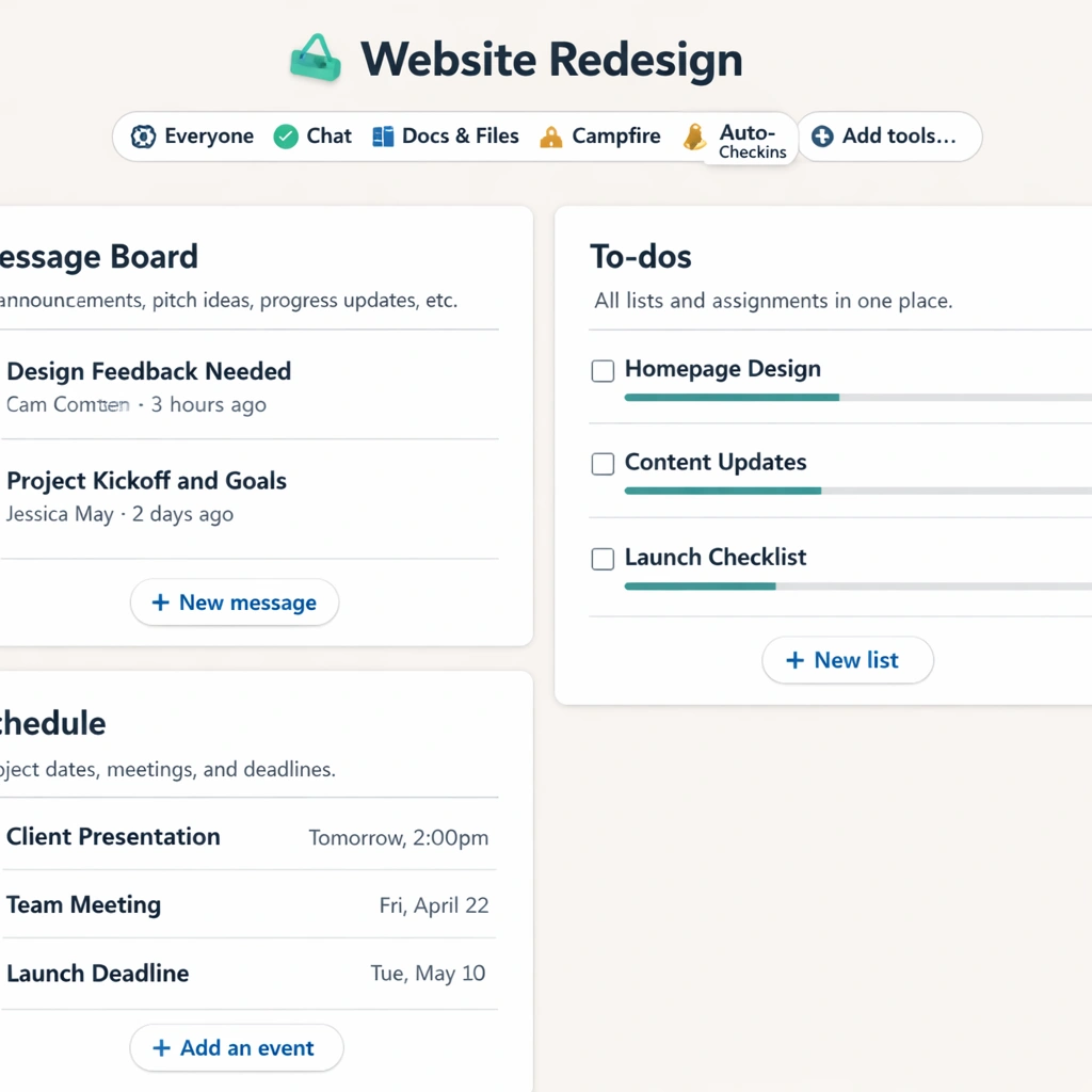 Basecamp takes a deliberately minimal approach to project management. It organizes work around projects, and each project contains a fixed set of tools: a message board, a to-do list, a document storage area, a schedule, and a group chat. That structure is intentional Basecamp believes that most teams add complexity to their workflow by using tools that offer too many options.