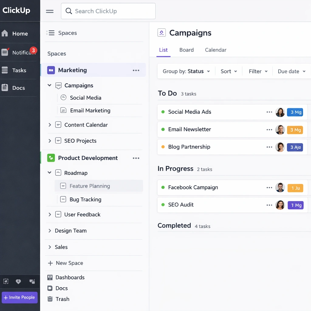 Once you have defined your operational structure on paper, translate it into the tool. The terminology varies by platform ClickUp uses Spaces, Folders, and Lists; Asana uses Teams, Projects, and Tasks; Notion uses databases and pages but the underlying architecture principle is the same across all of them.