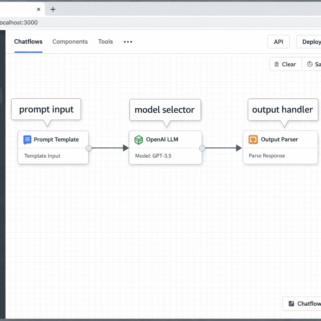 Flowise is an open-source, visual LLM workflow builder. You connect nodes — prompt templates, model connectors, memory modules, data retrievers — to build complete pipelines without writing code.