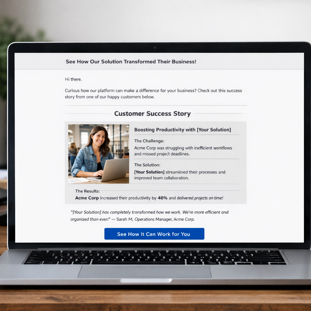 The nurture sequence is the second. For longer sales cycles, where a prospect may take weeks or months to convert, periodic emails that feature a detailed customer story or a before-and-after outcome keep the purchase intent alive. These emails should read like case studies, not testimonials — specific problem, specific solution, specific result.