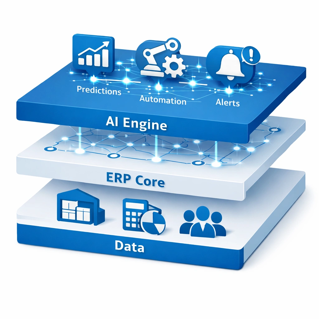 Traditional ERP systems were built to store and organize data. They were a step up from spreadsheets, but they still required a human to interpret the numbers and decide what to do next. What is AI ERP software in contrast? It’s a system that doesn’t just hold your data — it reads it, learns from it, and acts on it.