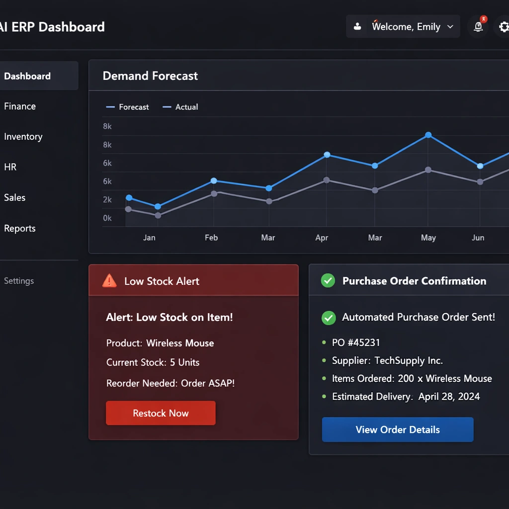 An AI ERP platform has visibility across your entire operation. It doesn’t just automate one task — it understands the relationship between tasks. A delay in your supply chain triggers an update in your production schedule, which adjusts your sales team’s delivery commitments, which updates your cash flow projection. That chain of connected responses is what separates a true ERP from a stack of disconnected automations.